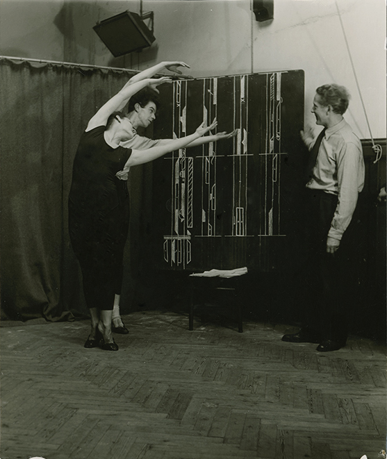 Leeder with two dancers in London in the 1950s. The photo demonstrates how Leeder integrated Laban concepts (eukinetics, choreutics) and notation tools in his teaching.